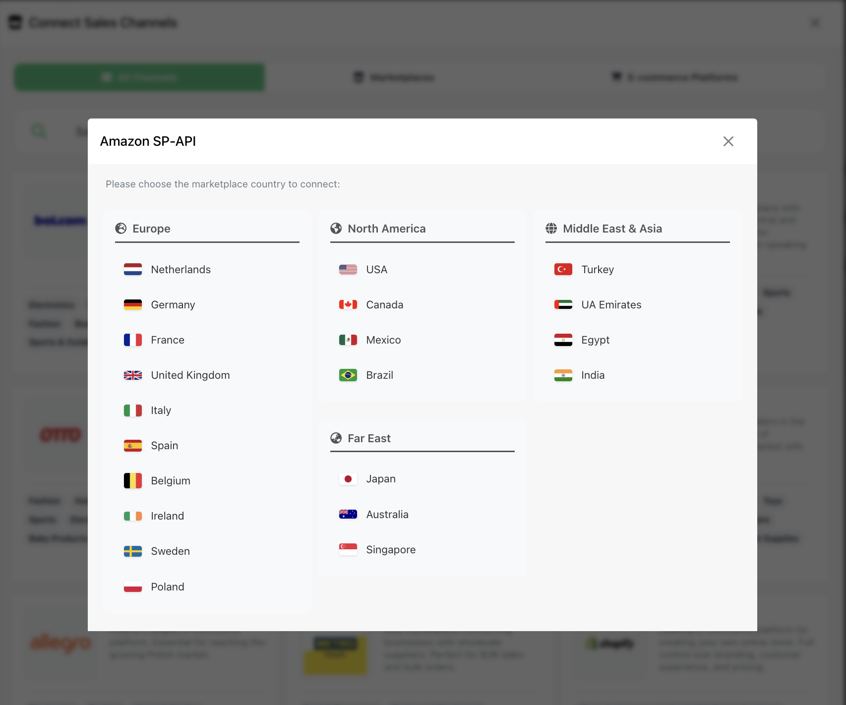 - Click on the Amazon logo and then select the marketplace country to connect. You will now be redirected to Amazon's App Marketplace.