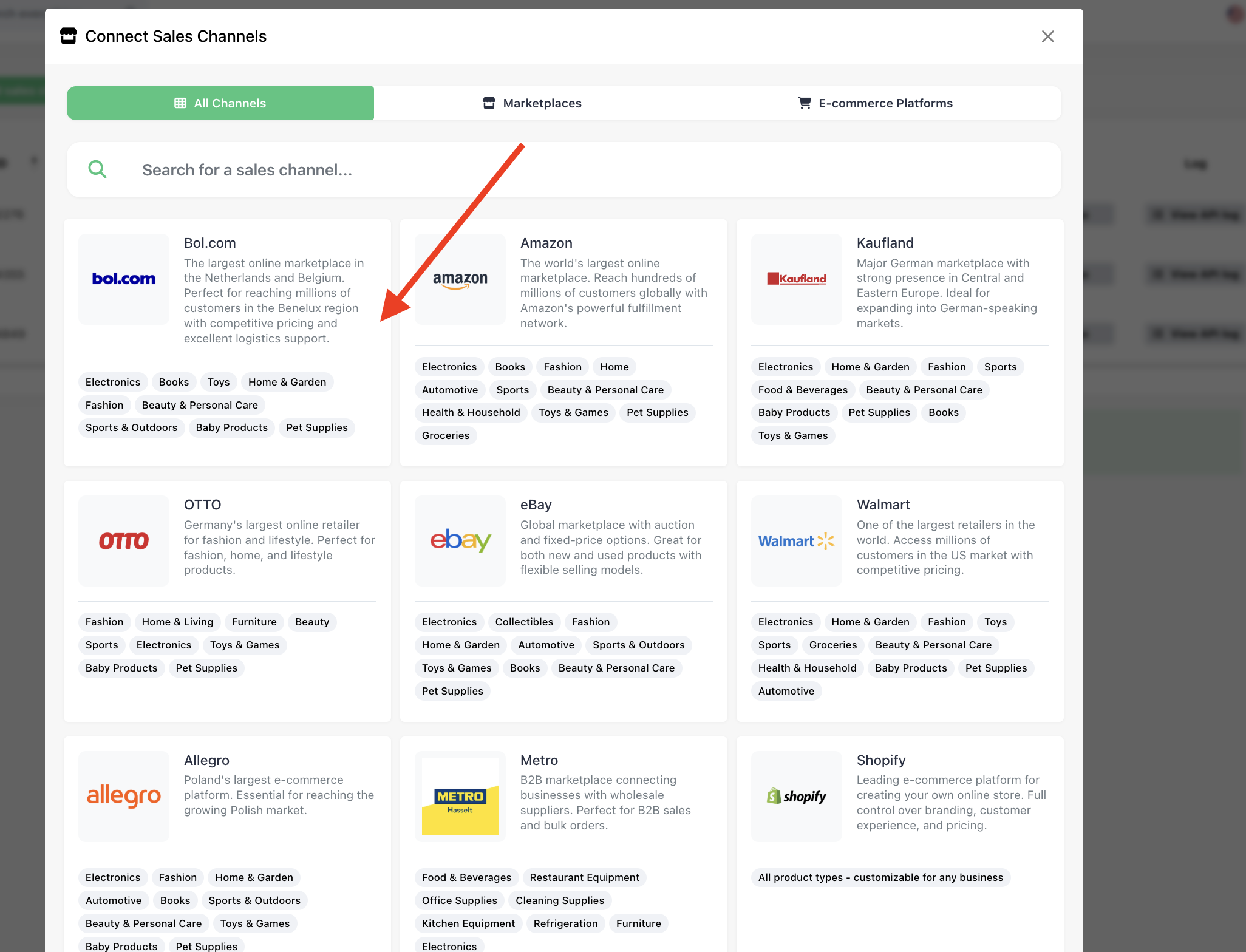 - Click on Bol.com -> Add Sales Channel -> Connect Bol.com