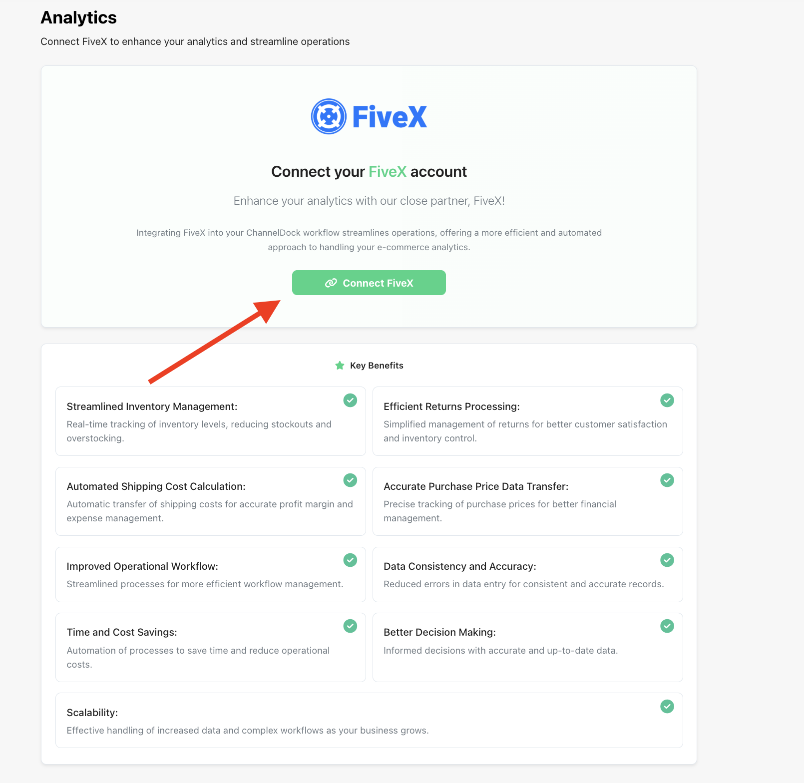 - Go to Settings > Analytics in ChannelDock and click 'Connect FiveX'
