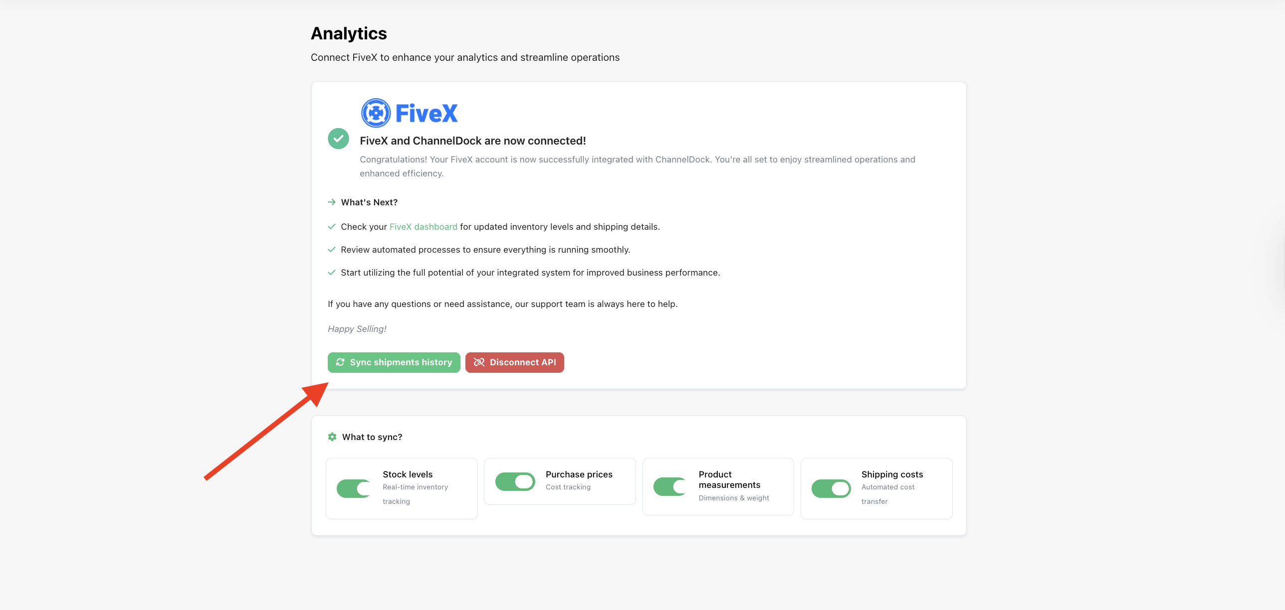 Once you've connected your ChannelDock account to FiveX, you can choose which data points to sync by toggling them on or off. This gives you full control over what information is shared between the platforms.