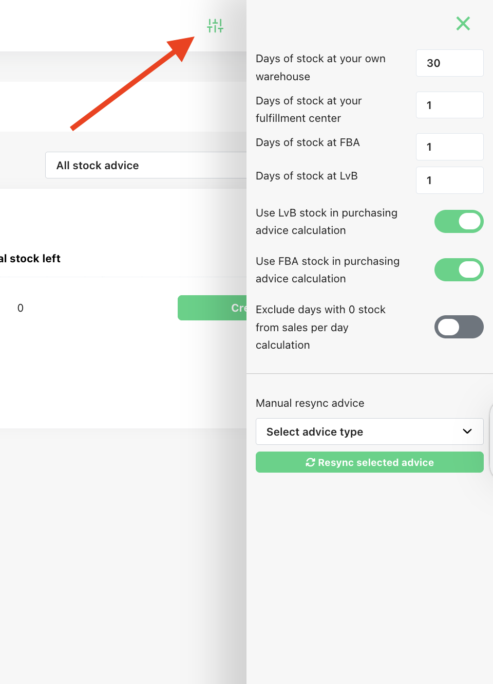 8. Manual resync advice – Select advice type > Dropdown where you choose which type of stock advice (warehouse, FBA, LvB, etc.) you want to refresh.