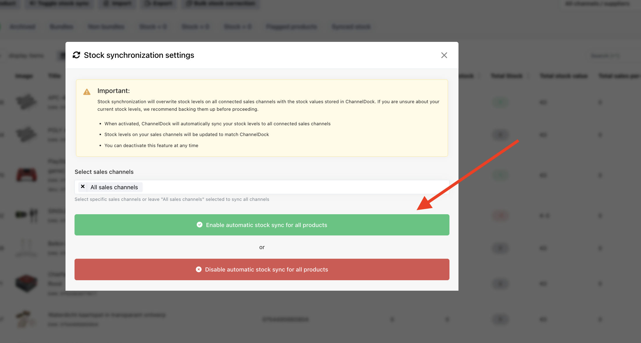 Now that you've successfully turned on inventory synchronization for your products, it's important to know that if you want to update your inventory, from now on, you always do it from ChannelDock. ChannelDock then syncs your new stock levels to your sales channels.